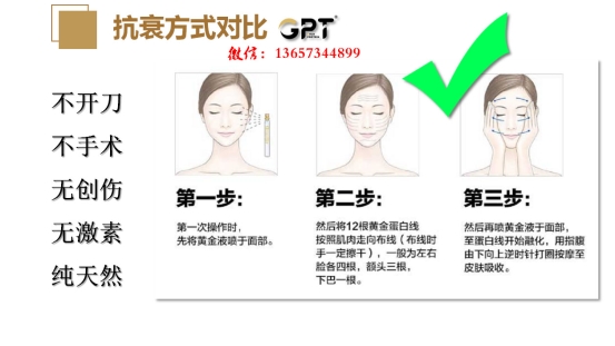 GPT黄金线雕是什么?GPT黄金线雕是一款抗衰老产品,去皱纹只需要5分钟就能够减小。为什么它能有这样的功效?GPT黄金线雕是通过PCR(聚合酶链式反应)技术,复制胶原蛋白,修复断裂纤维,填充皮肤凹陷,重塑青春容颜。重点是,这款产品不限制使用的年龄,越早抗衰老,效果会越明显的。